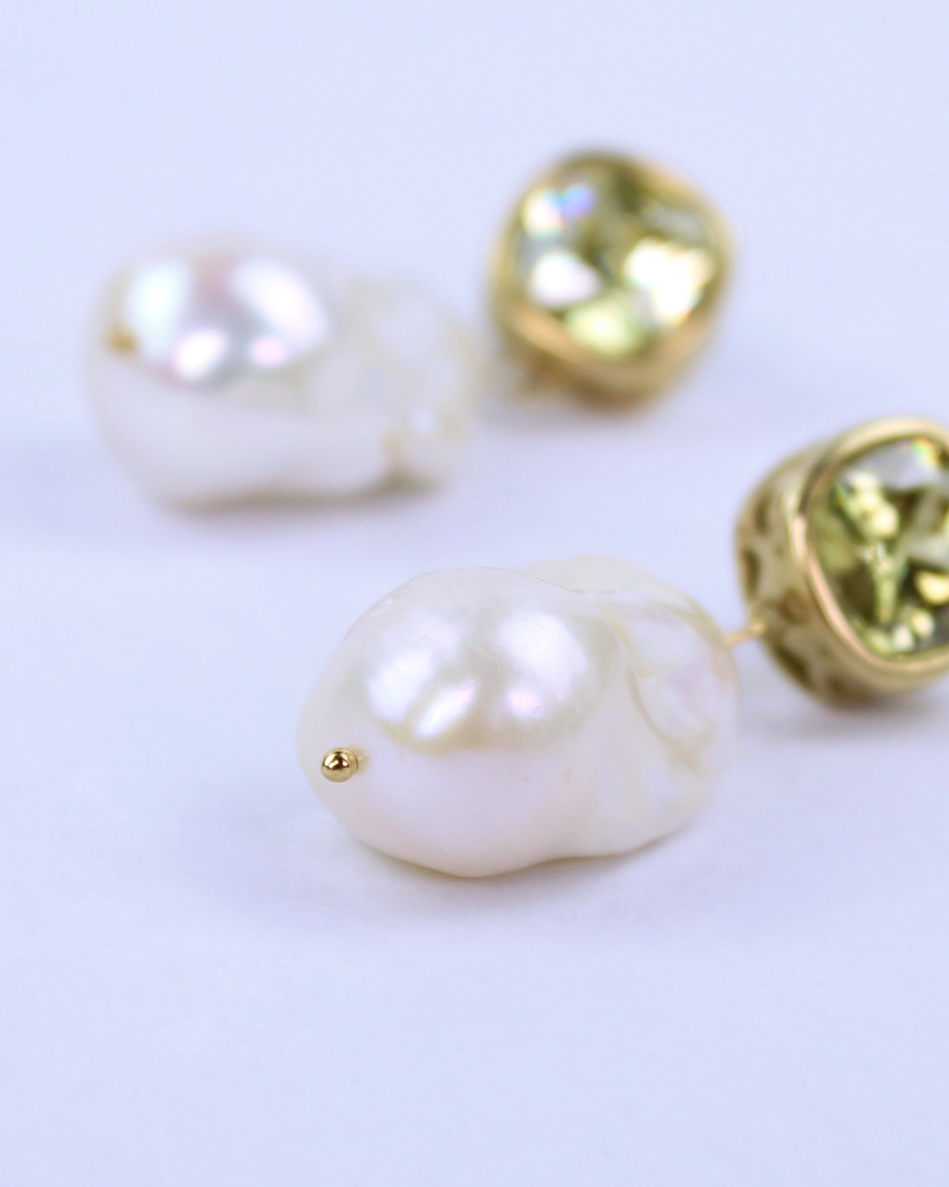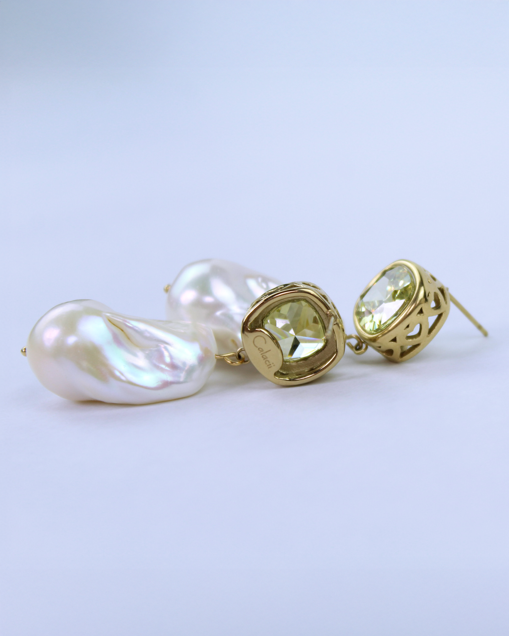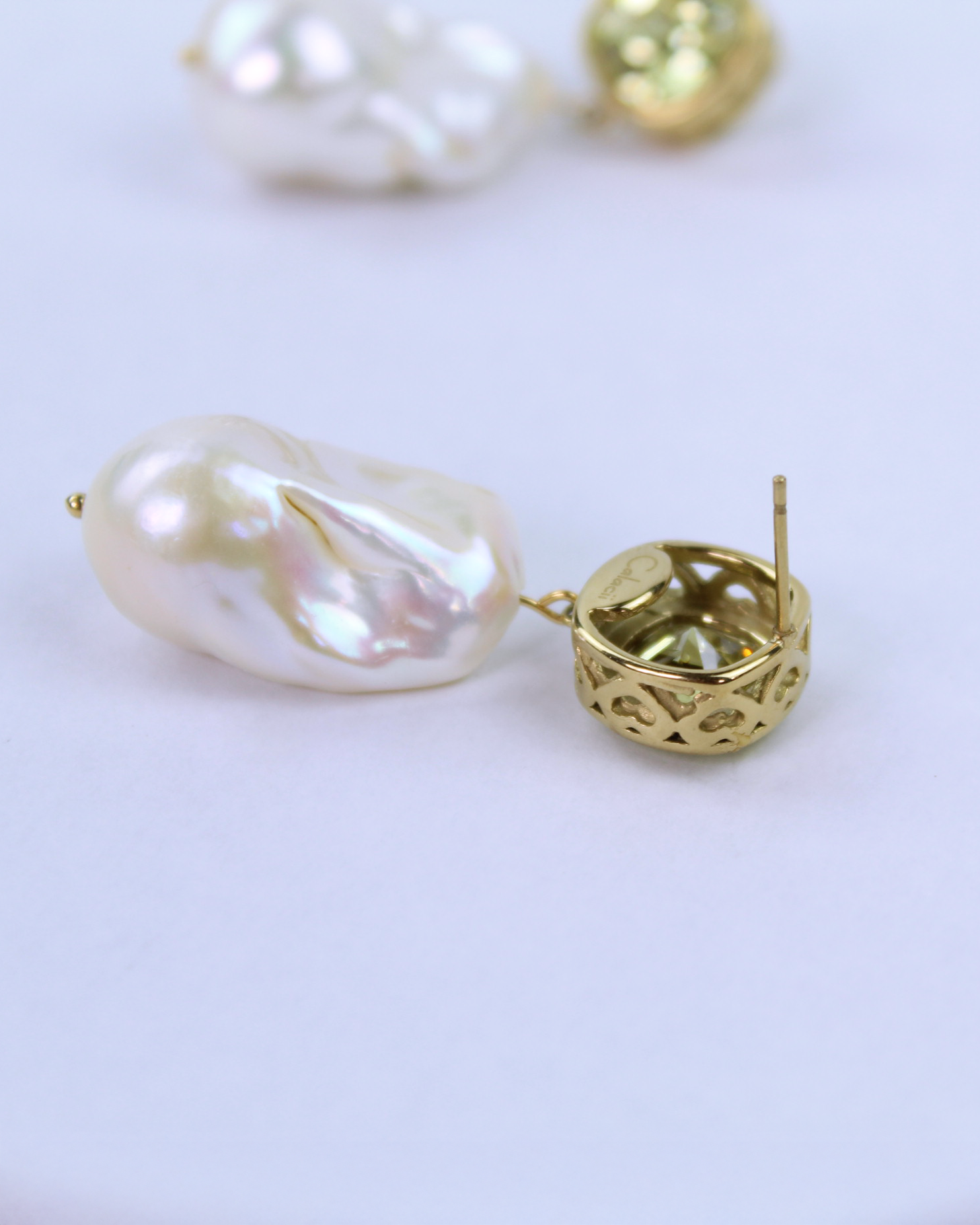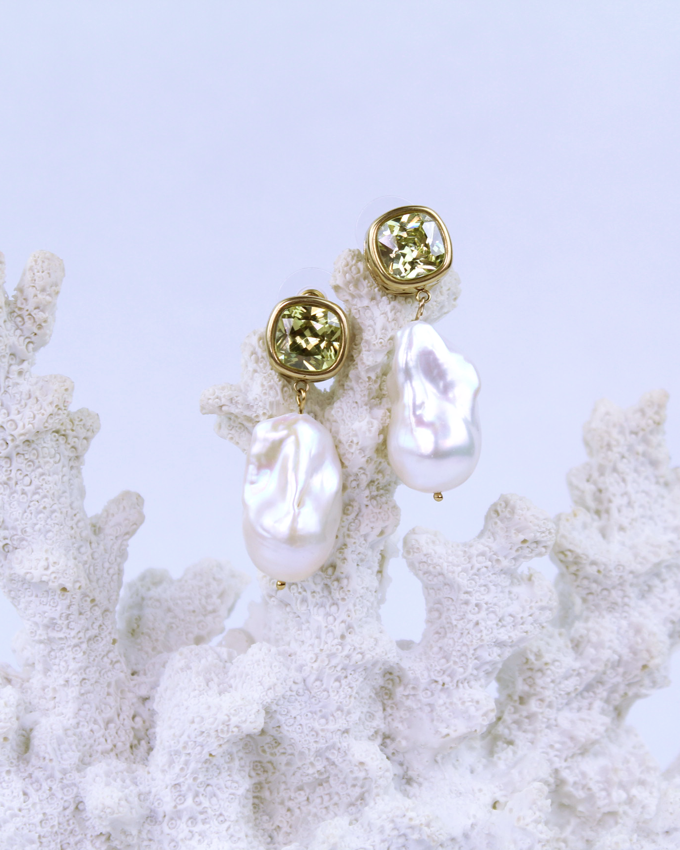 Die ungezähmte Schönheit barocker Süßwasserperlen trifft auf fein verarbeiten Edelstahl mit 14-karat- Vergoldung.