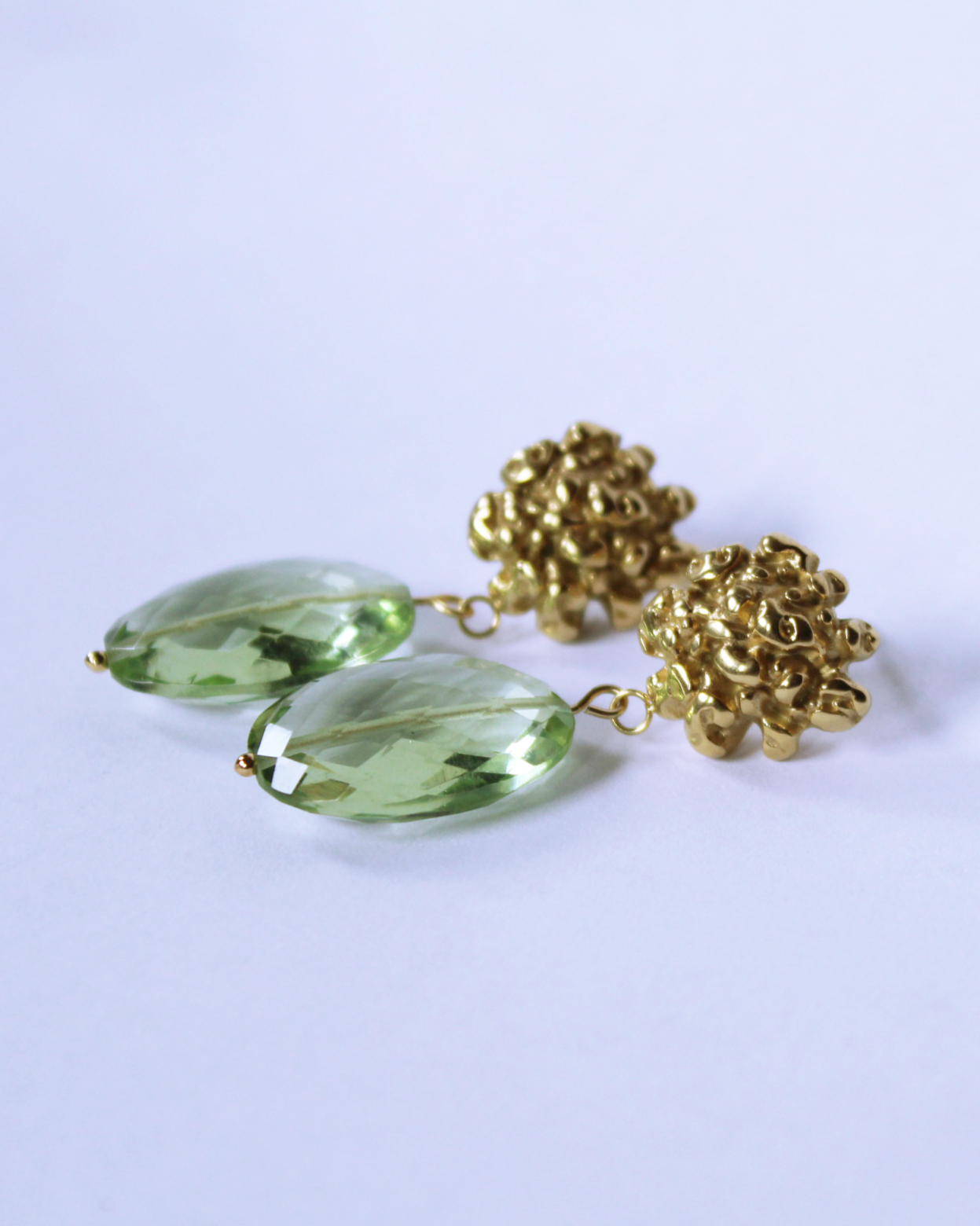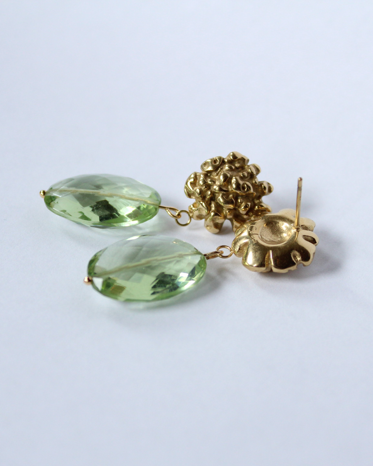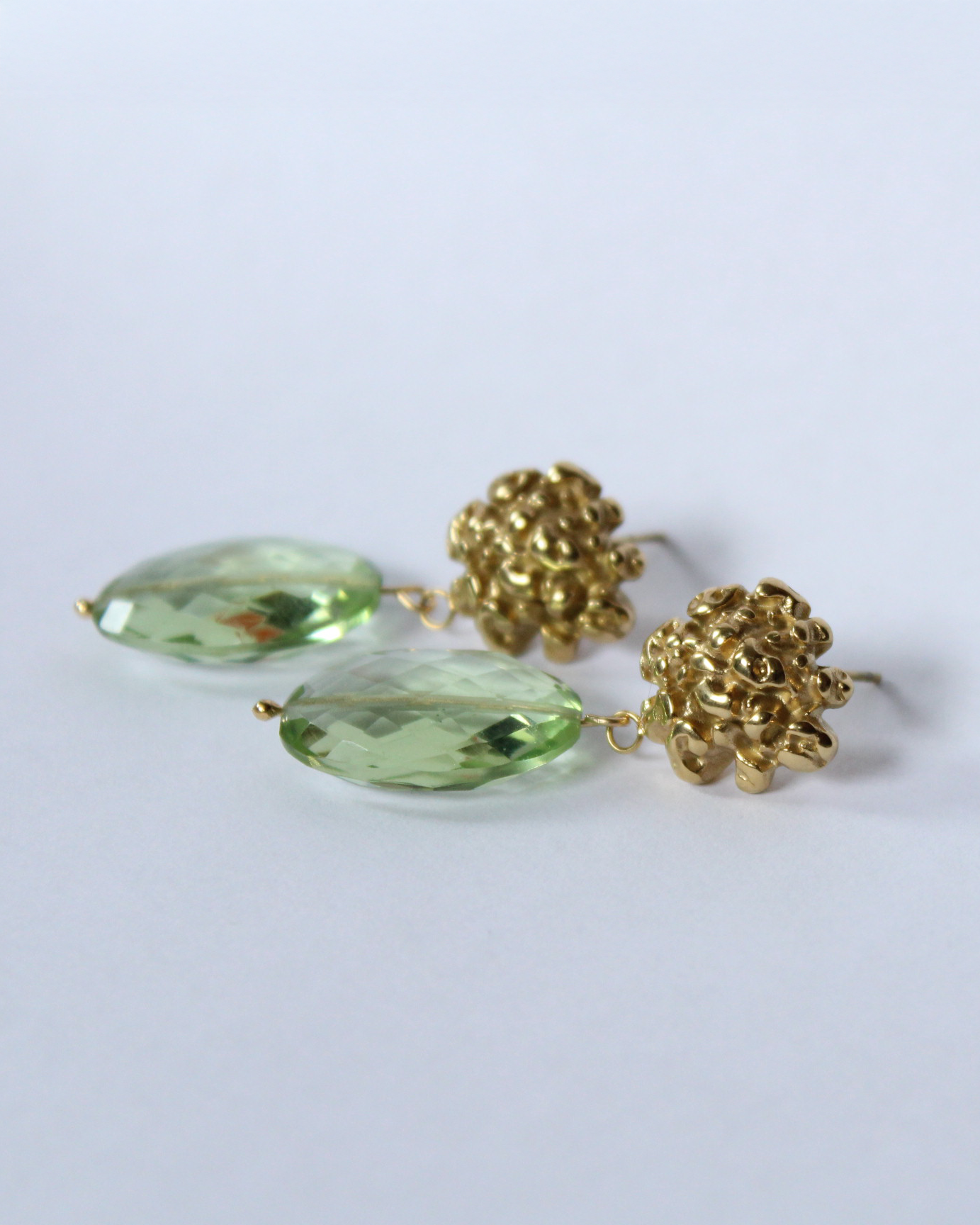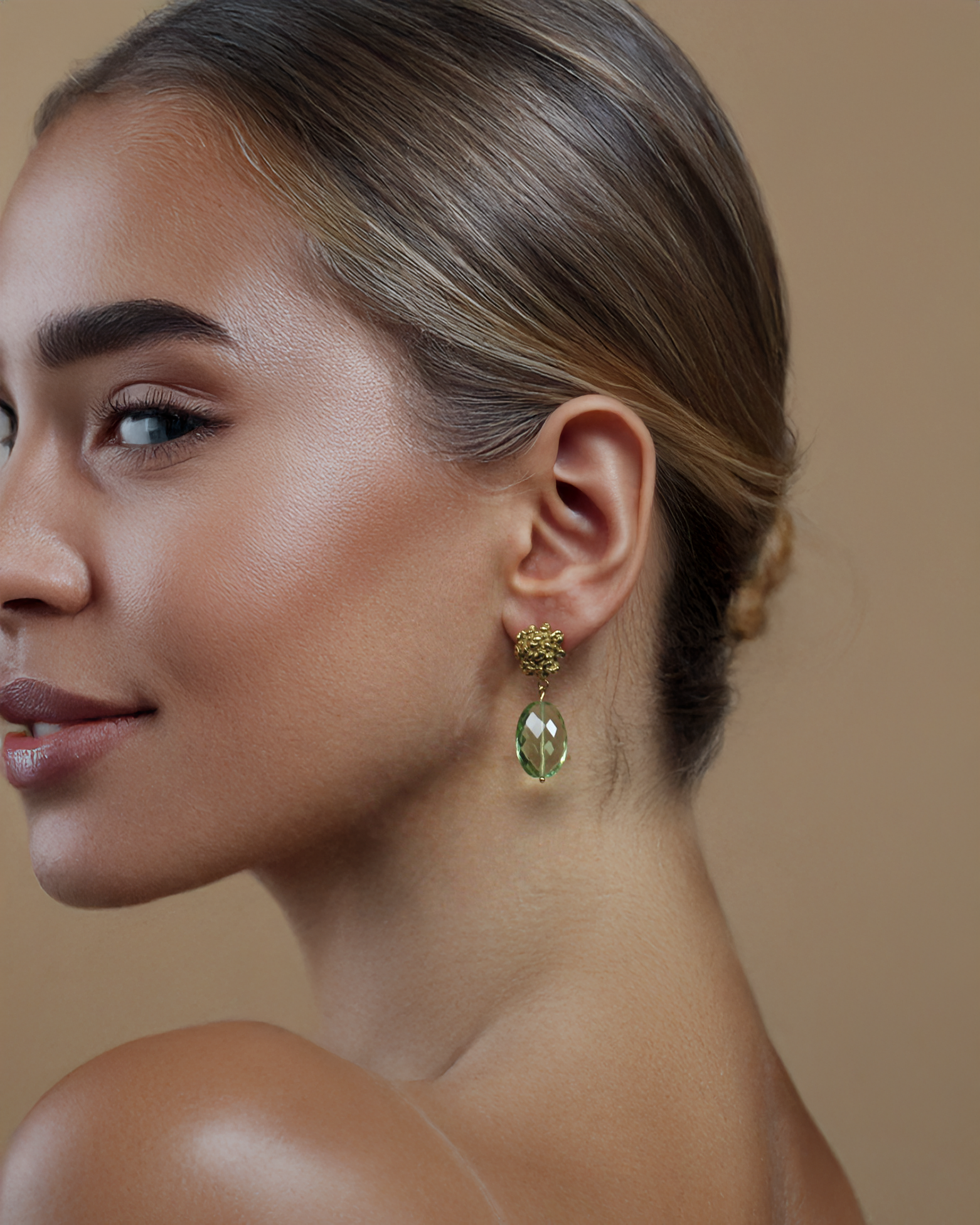 Diese eleganten Ohrstecker vereinen maritime Inspiration mit edlem Glanz. Das Oberteil aus 14k vergoldetem Edelstahl ist kunstvoll in Form einer Koralle gestaltet. Darunter schwingen Tropfen aus hellgrünem, facettierem Hydro-Quarz, die bei jeder Bewegung das Licht einfangen und ein zartes Funkeln erzeugen.