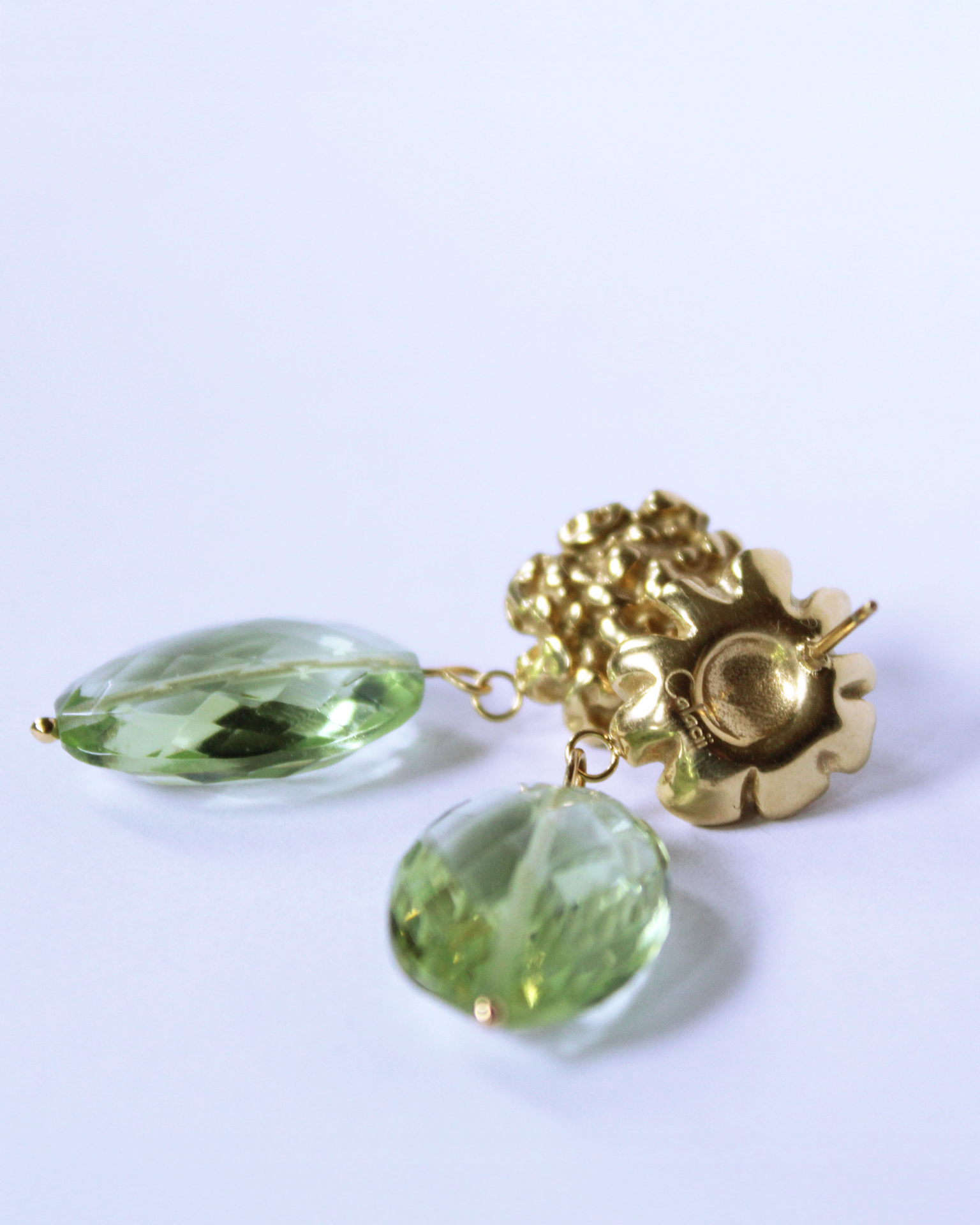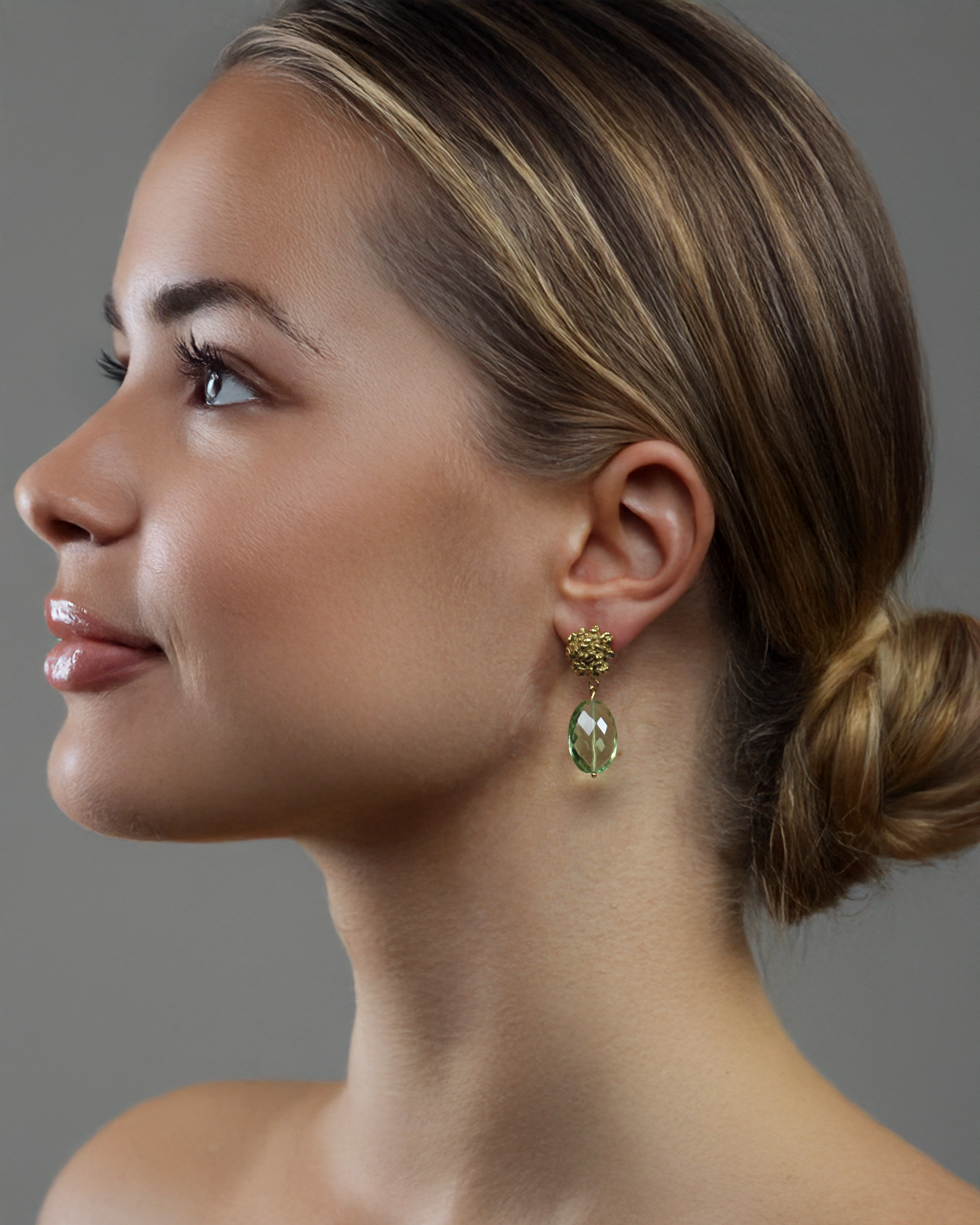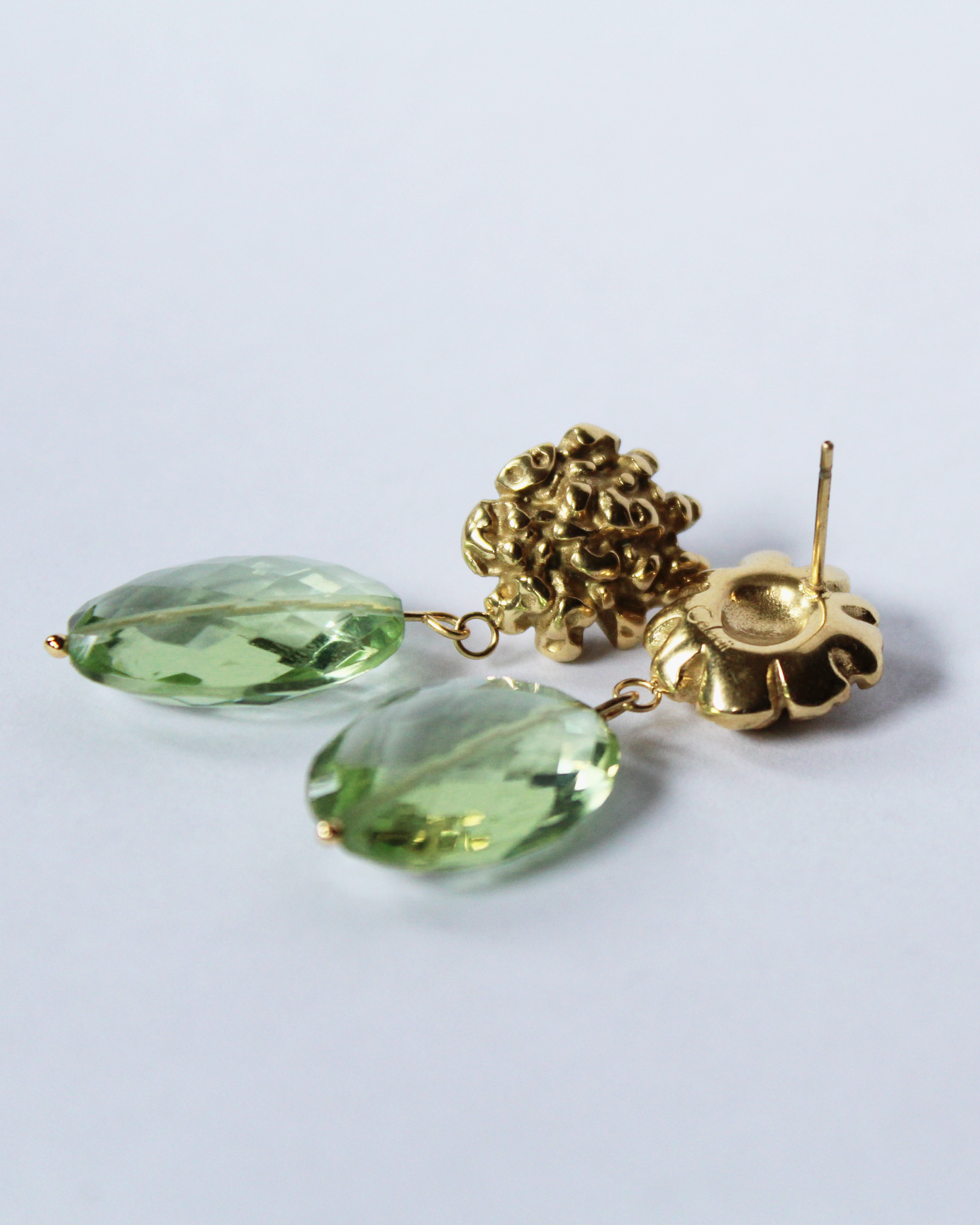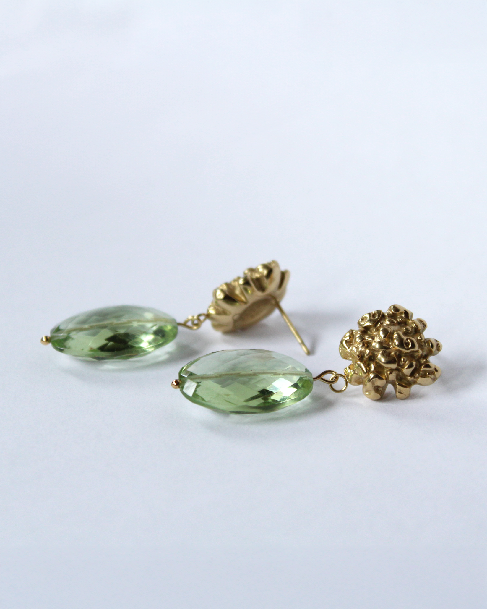 Diese eleganten Ohrstecker vereinen maritime Inspiration mit edlem Glanz. Das Oberteil aus 14k vergoldetem Edelstahl ist kunstvoll in Form einer Koralle gestaltet. Darunter schwingen Tropfen aus hellgrünem, facettierem Hydro-Quarz, die bei jeder Bewegung das Licht einfangen und ein zartes Funkeln erzeugen.