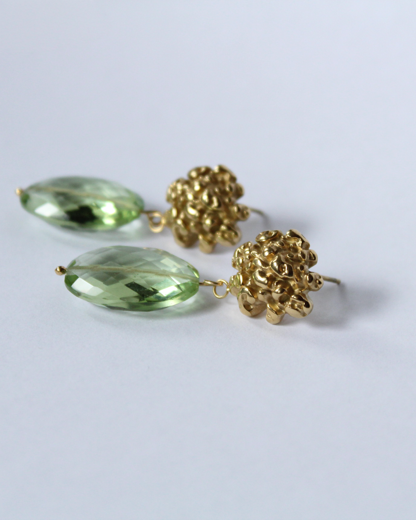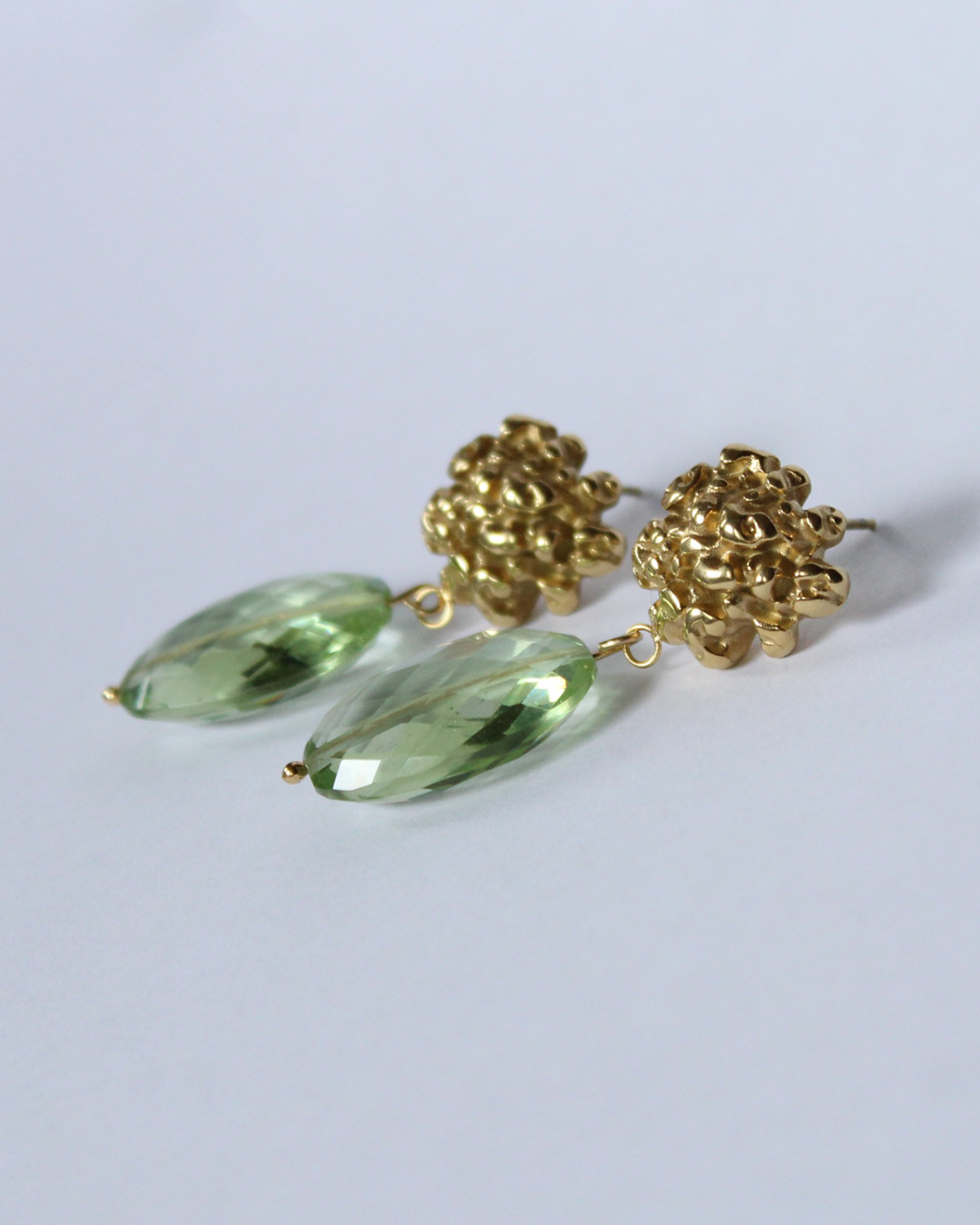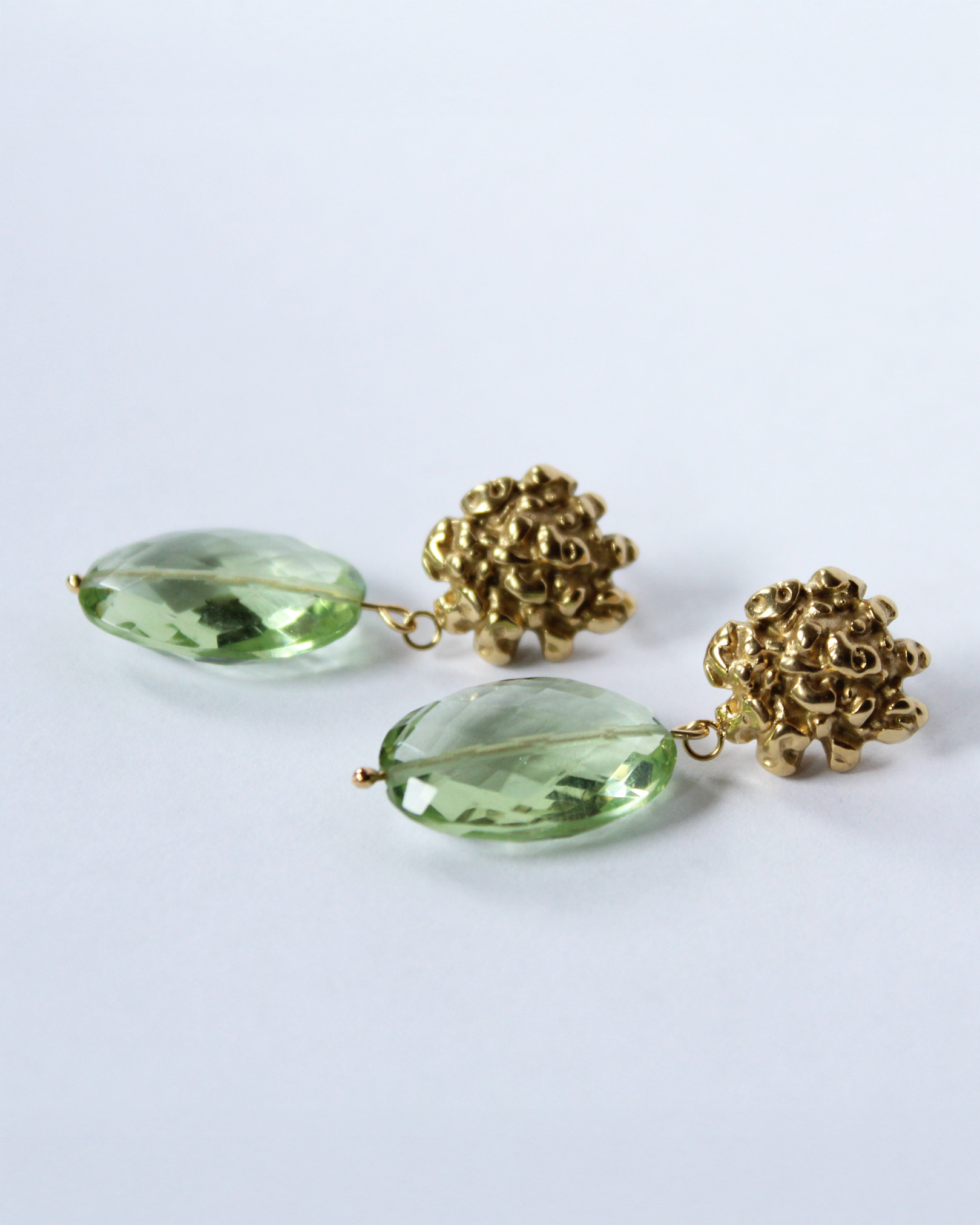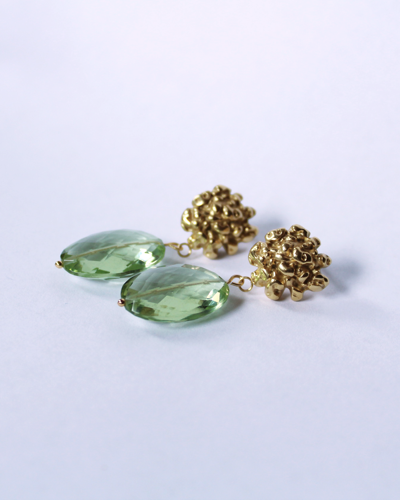 Diese eleganten Ohrstecker vereinen maritime Inspiration mit edlem Glanz. Das Oberteil aus 14k vergoldetem Edelstahl ist kunstvoll in Form einer Koralle gestaltet. Darunter schwingen Tropfen aus hellgrünem, facettierem Hydro-Quarz, die bei jeder Bewegung das Licht einfangen und ein zartes Funkeln erzeugen.